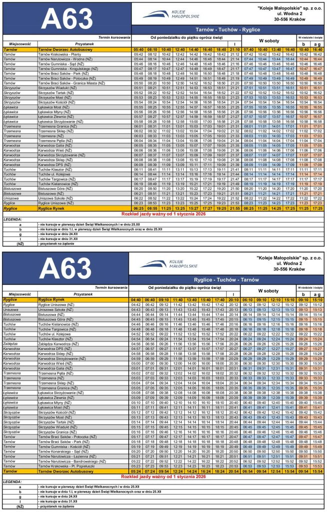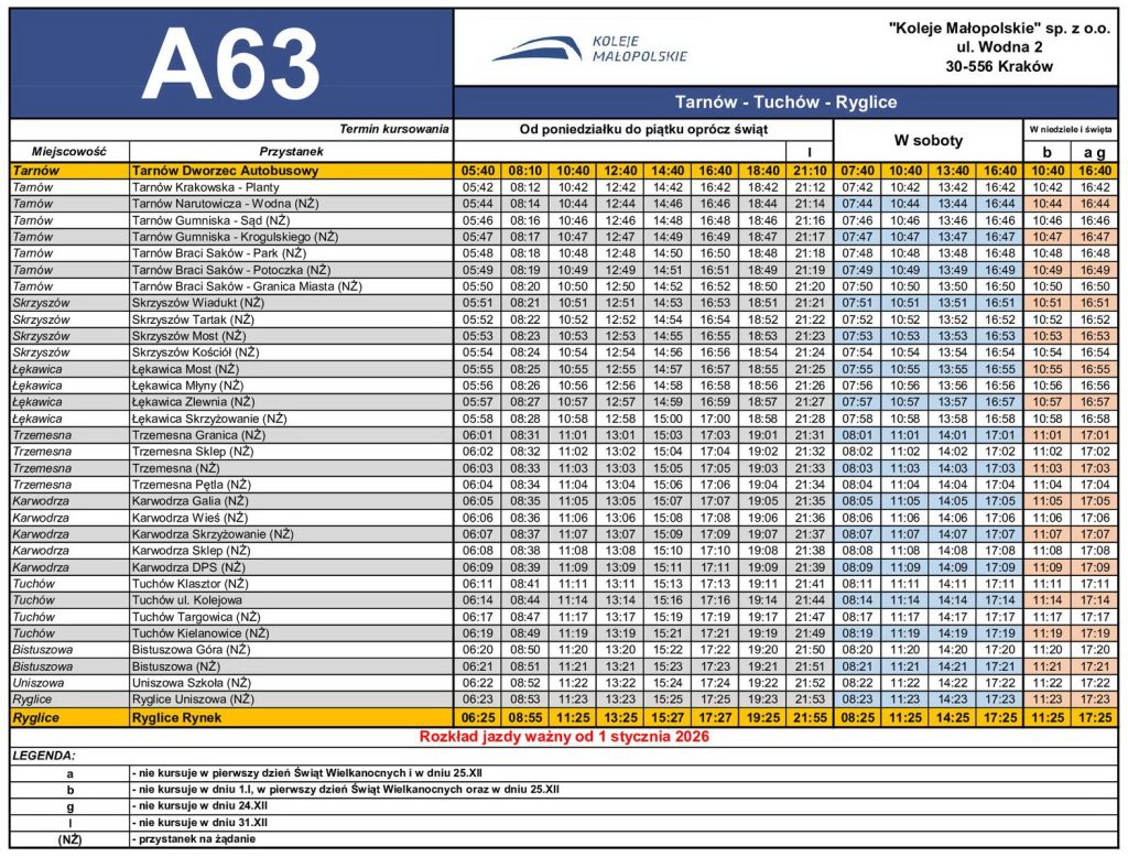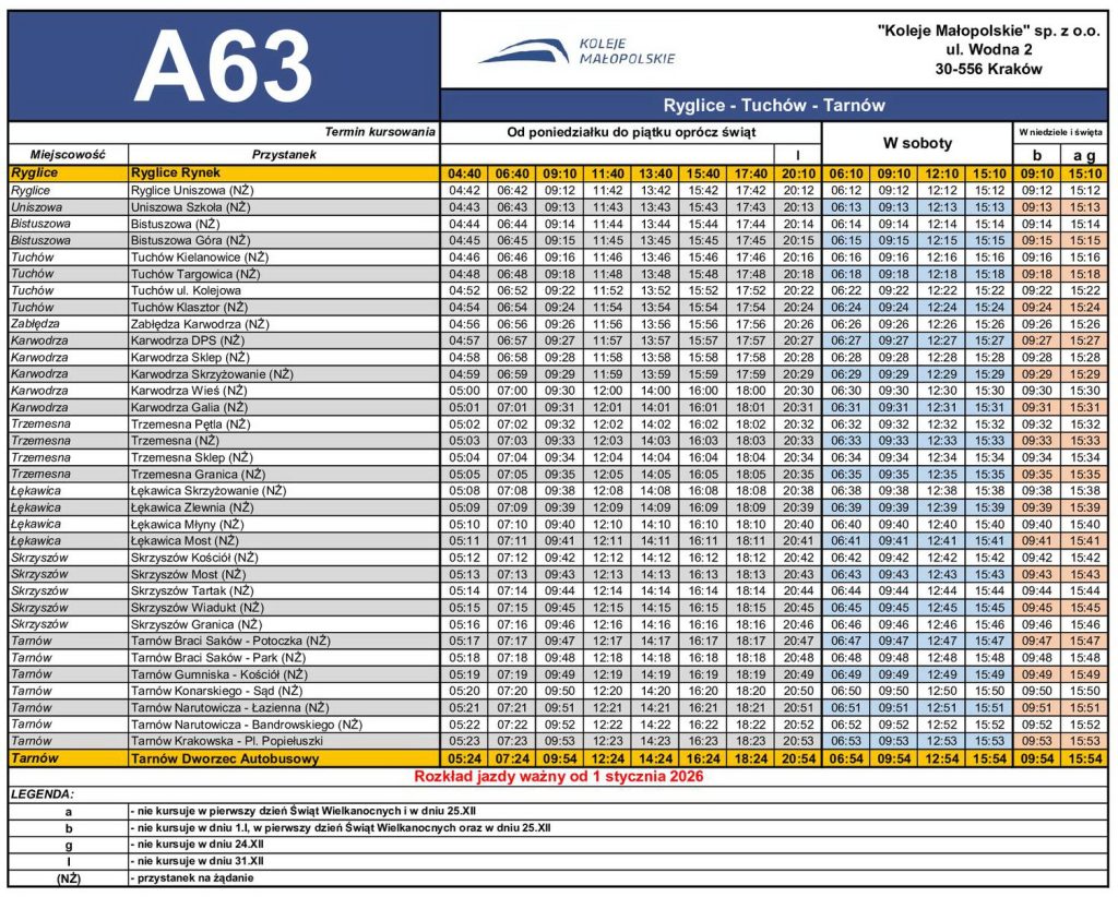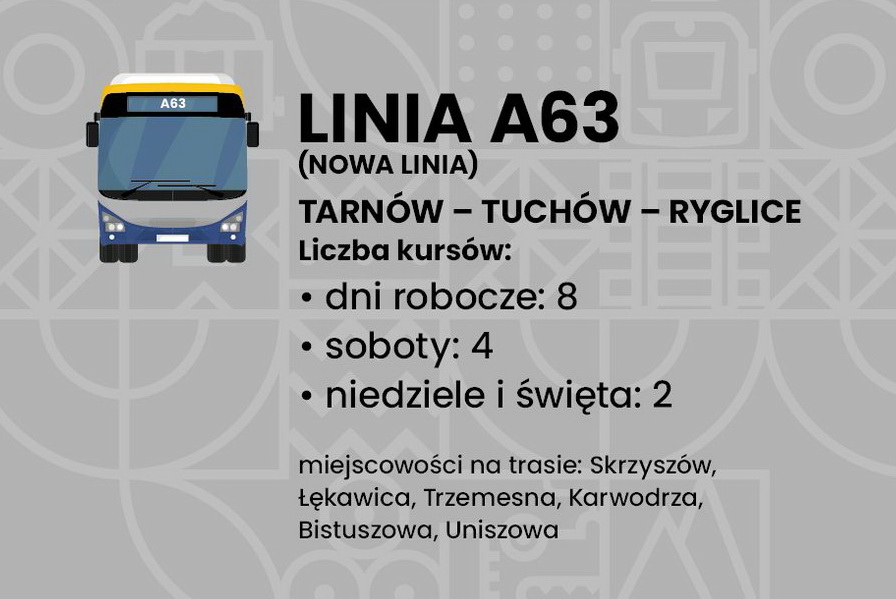 8 kursów w dni robocze, 4 kursy w soboty i 2 kursy w niedzielę i święta, to NOWA LINIA A63.