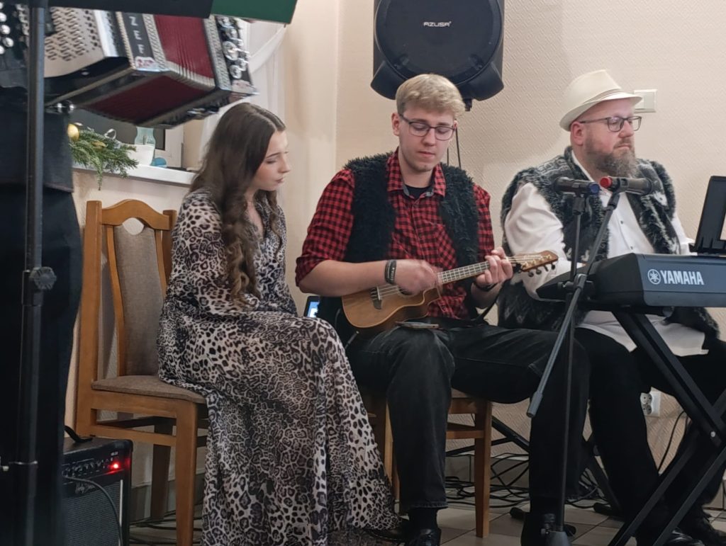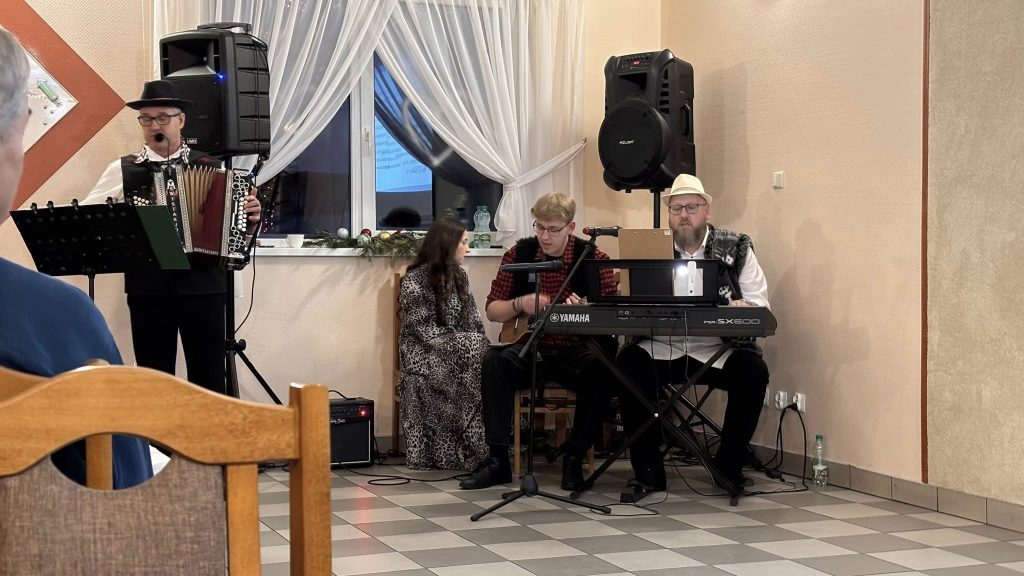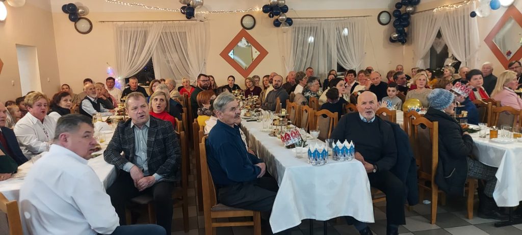 Do gromkiego śpiewania kolęd, których teksty wyświetlanie były na ekranie, przygrywał zespół złożony z harmonii heligonki, elektronicznego pianina i elektro-akustycznego ukulele. Przez ponad 3 godziny, przybili licznie goście na zmianę gromko wyśpiewywali kolędy, oraz raczyli się tradycyjnie pysznymi ciastami przygotowanymi przez Panie ze stowarzyszenia. Wyśpiewaliśmy ponad 20 kolęd i pastorałek, a na koniec zaśpiewaliśmy piosenkę-niespodziankę dla naszego sołtysa Michała Mikosa z okazji jego zbliżających się urodzin. Cały wieczór zakończył się dobrze po godzinie 19 kilkoma piosenkami biesiadnymi w wykonaniu naszego zaprzyjaźnionego harmonisty Józefa, który po raz pierwszy, lecz mamy nadzieję nie ostatni uświetnił nasze kolędowanie w Święto Trzech Króli.